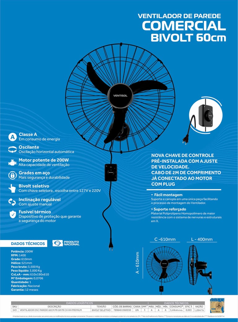 Perfeito para quem busca qualidade, desempenho e conforto, o Ventilador de Parede Bivolt é sinônimo de força e confiabilidade para grandes espaços.